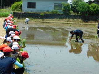 今日はPTA会長のご主人の指導をいただき手植えで田植えを行いました。子供達からは,「まっすぐに植えるのは難しいなぁ。」「田植えは初めてだったけど楽しかった。」等の感想がありました。秋にこの稲から実ったお米を収穫し調理実習で炊くのが今から楽しみです。