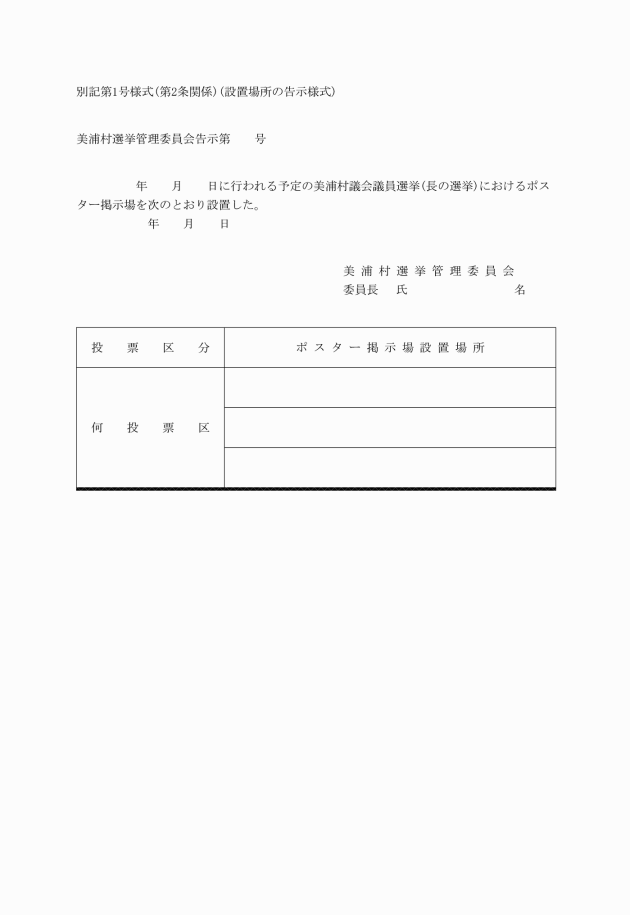 第2条 美浦村選挙管理委員会(以下「委員会」という。)は、掲示場を設置したときは、別記第1号様式により直ちに告示しなければならない。