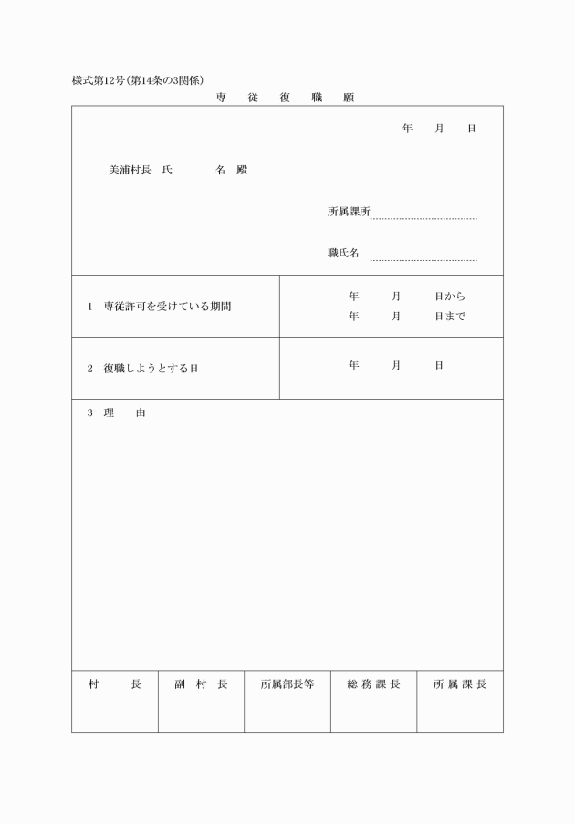 第13条の2 職員が、美浦村職員の職務に専念する義務の特例に関する条例(昭和30年美浦村条例第14号)の規定に基づき、職務専念義務の免除(以下本条において「職免」という。)について承認を受けようとする場合は、職務専念義務免除願(様式第9号)によるものとする。ただし、2日以上にわならない半日又は1時間単位の職免を受けようとする場合は、書面によらないことができる。