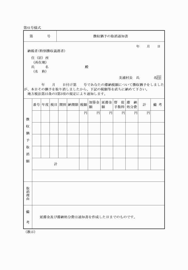 5 村長は、法第15条の2の3第2項の規定により、財産の差押を解除するときは徴収猶予に係る差押解除通知書により、納税者又は特別徴収義務者に通知しなければならない。