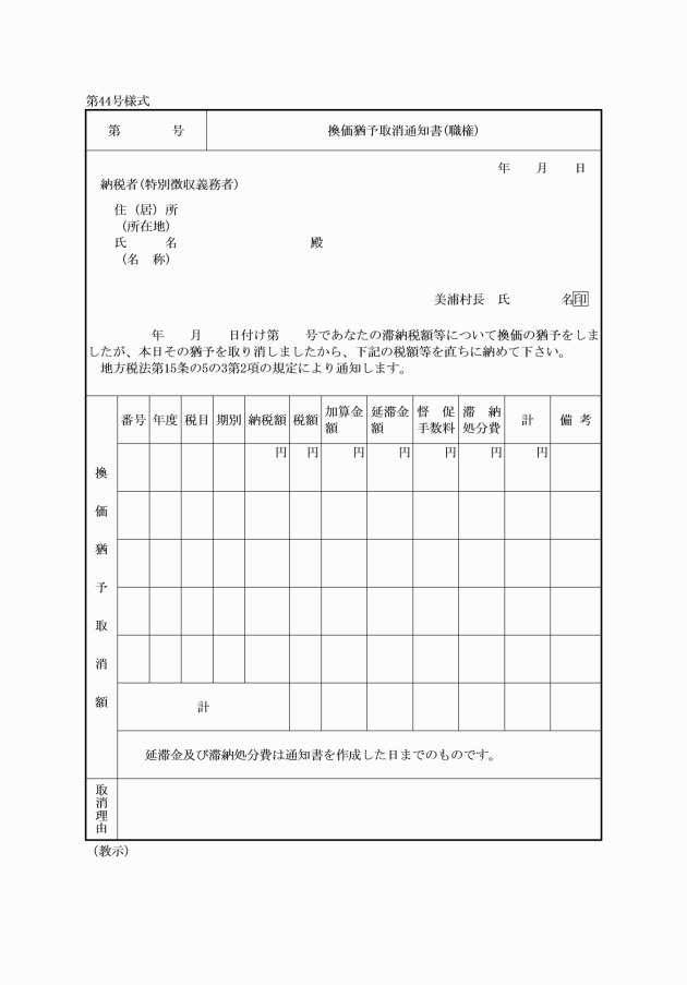 第10条 村長は、法第15条の3第1項又は第15条の5の3第2項の規定に該当するときは、ただちに徴収猶予の取消通知書又は換価の猶予の取消通知書により納税者又は特別徴収義務者にその旨を通知しなければならない。