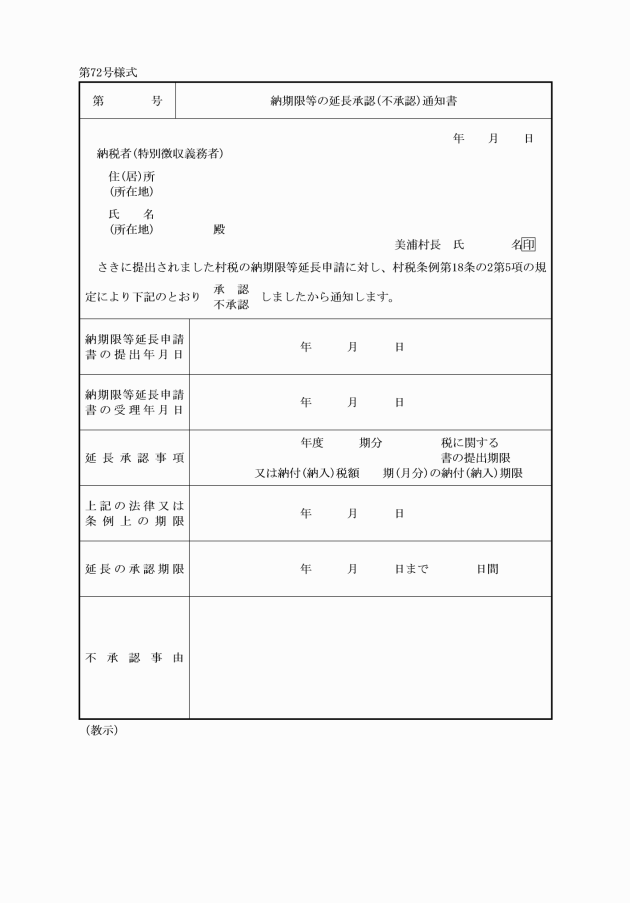 3 村長は、法第15条の2の2の規定により徴収猶予又は期間の延長を認めた場合は、徴収猶予(期間の延長)承認通知書、認めない場合は、徴収猶予(期間の延長)不承認通知書によってその旨を当該申請者に通知しなければならない。