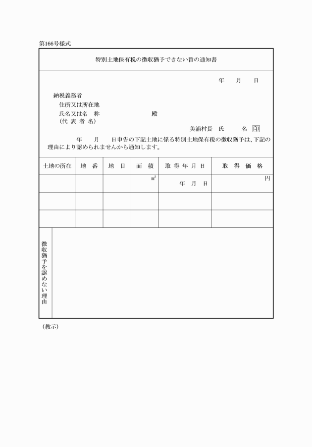特別土地保有税徴収猶予できない旨の通知書 | 法第603条第3項 | 第166号 |