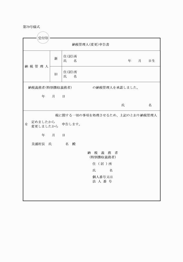 第7条 村長が備えなければならない台帳及び帳簿並びにこれらの様式は下に掲げるものとする。ただし、下に掲げるもののうち、美浦村行政手続等における情報通信の技術の利用に関する条例(平成16年条例第17号)第1項及び第2項の規定を適用する場合においては、当該書面等に係る電磁的記録として備えることができる。