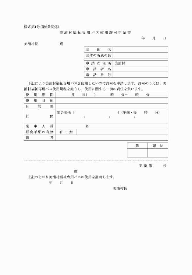 第6条 使用者の責任者は、使用予定の20日前までに福祉専用バス使用許可申請書(様式第1号)を村長に提出し、許可を受けなければならない。ただし、緊急用務のため使用申請の手続きをとる時間的余裕のない時は、当該用務終了後直ちに使用申請の手続きを経なければならない。