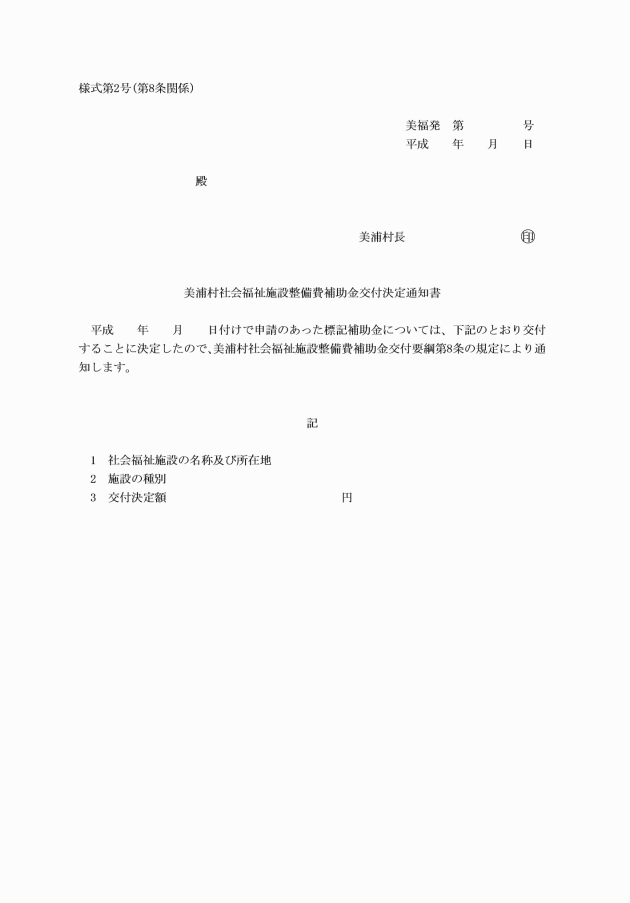 第7条 この補助金の交付申請は、社会福祉施設整備費補助金交付申請書(様式第1号)による申請書を村長に提出して行うものとする。