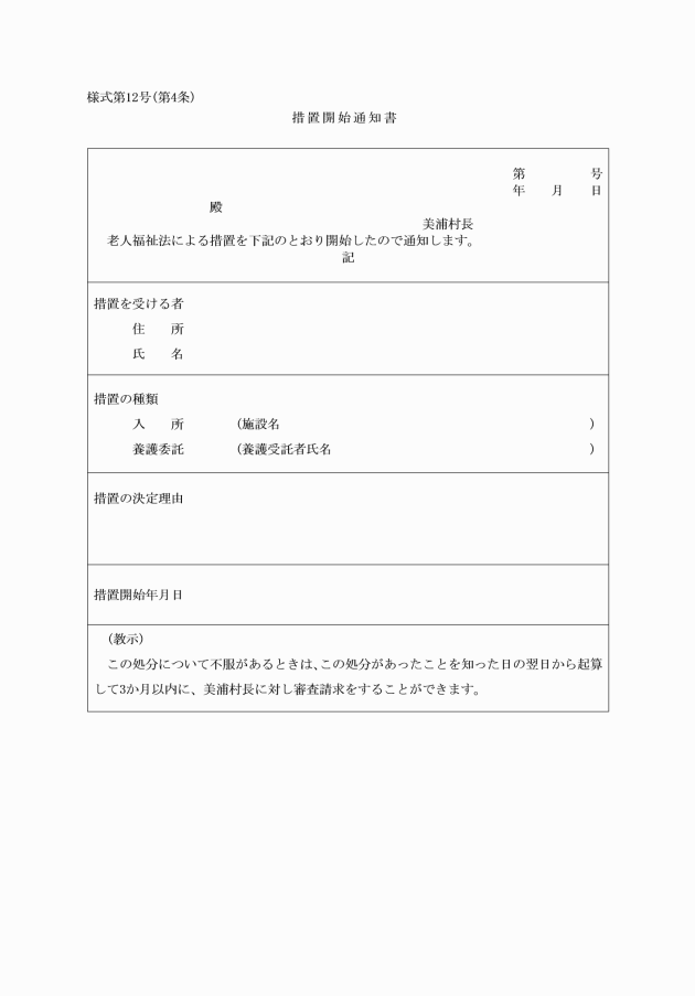 第7条 村長は、法第11条第2項の規定によって、老人ホーム又は養護受託者にその葬祭を委託するときは、様式第23号の葬祭依頼書により、当該施設の長若しくは養護受託者に通知しなければならない。