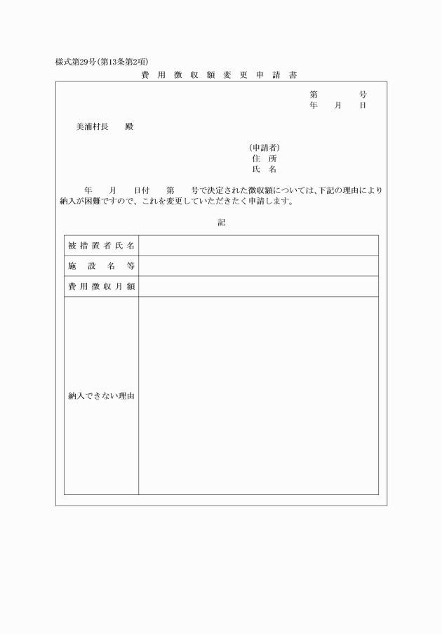 第13条 村長は、収入の減少その他やむを得ない事由により、納入義務者の負担能力に著しい変動が生じたときは、その変動の程度に応じ前条の規定により決定した徴収額を変更することができる。
