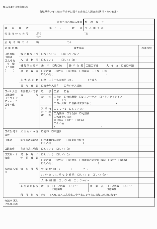 第4条 立入調査は、県条例第44条第1項に規定する者(以下「営業者等」という。)又は営業者等の営業所その他営業に関係する場所を対象とし、その把握にあたっては、「青少年の健全育成に協力する店」の登録状況及び当該店舗の巡回結果状況等から営業者等の県条例遵守状況を把握するほか、自動販売機等業者に対する県条例に係る履行義務のチラシ(別表第1)を配布するなど、普段から啓発と情報収集を行い、その把握に努めるものとする。