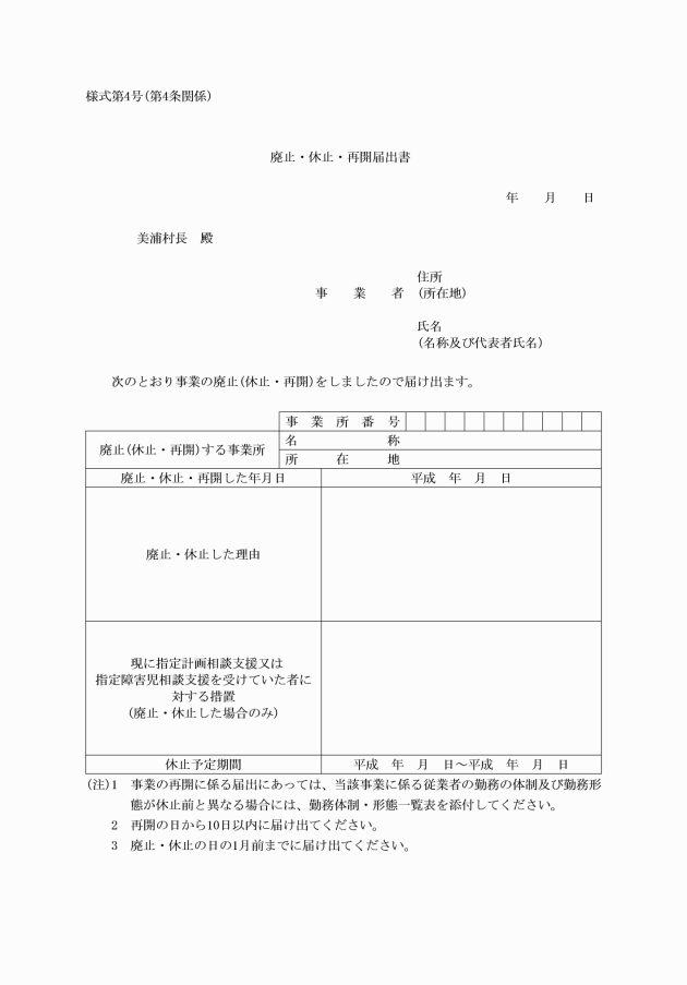 第6条 村長は、障害者総合支援法第51条の29第2項及び児童福祉法第24条の36の規定による指定の取消し又は指定の効力の停止をしたときは、美浦村障害者(児)相談支援事業所指定取消(効力の停止)決定通知書(様式第7号)により、当該指定の取消し又は指定の効力の停止をした者に通知するものとする。