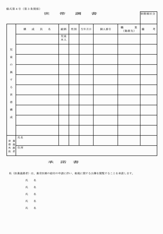 第5条 省令第9条第2項の養育医療券(以下「養育医療券」という。)の交付を受けた者は、当該医療券の有効期間を超えて養育医療の給付を受けようとするときは、事前に養育医療継続承認申請書(様式第5号)を村長に提出しなければならない。