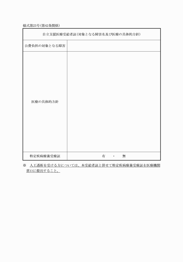 第41条 施行規則第35条第1項に規定する申請書は、自立支援医療費(育成・更生)支給認定申請書(新規・再認定・変更)(様式第22号)とする。