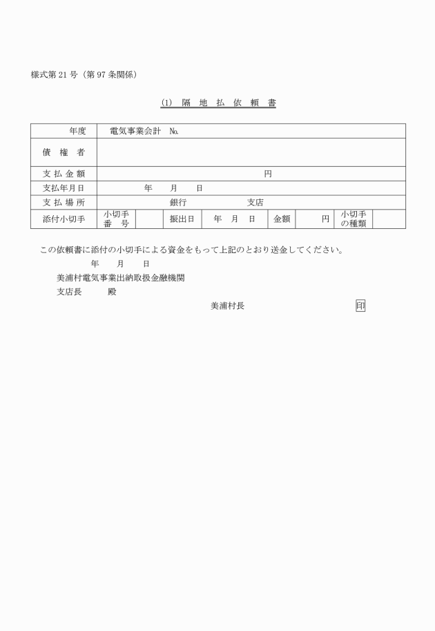 第4条 電気事業の管理者の権限を行う村長(以下「管理者」という。)は、電気事業の業務に係る公金の出納事務の一部を村長の同意を得て指定した金融機関に行わせるものとする。