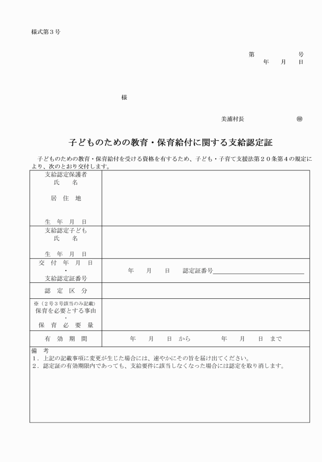 第7条 村長は、支給認定を行ったときは、子どものための教育・保育給付に関する支給認定証(様式第3号)を当該申請者に交付するものとする。