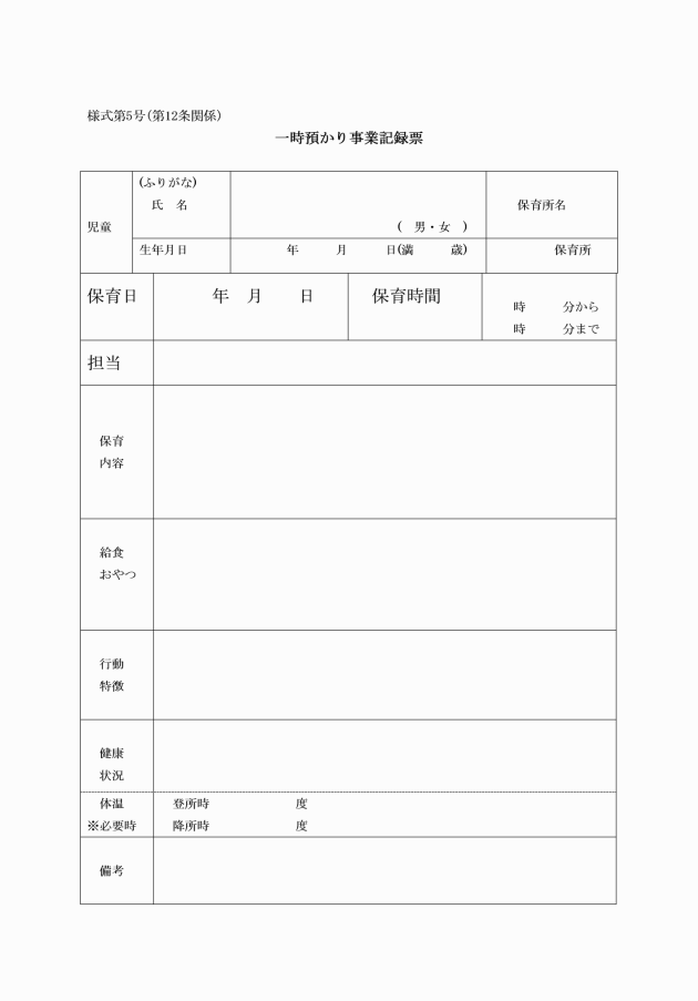 第12条 実施保育所は、事業を利用する児童の保育内容等について、一時預かり事業記録票(様式第5号)に記録しなければならない。