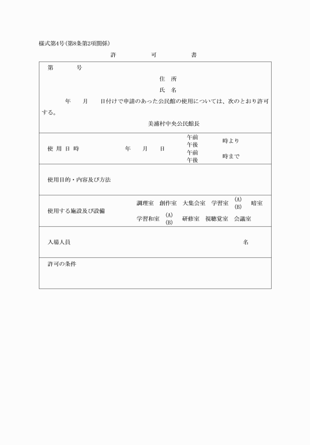 第8条 公民館の施設若しくは設備(図書室、閲覧室及び第13条第1項第4号に規定する資料を除く。)を使用しようとする者(以下「使用者」という。)は、当該使用予定日の5日前(提出期限日が休館日の場合はその直前の開館日)までに公民館使用許可申請書(様式第3号)を館長に提出し、その許可を受けなければならない。