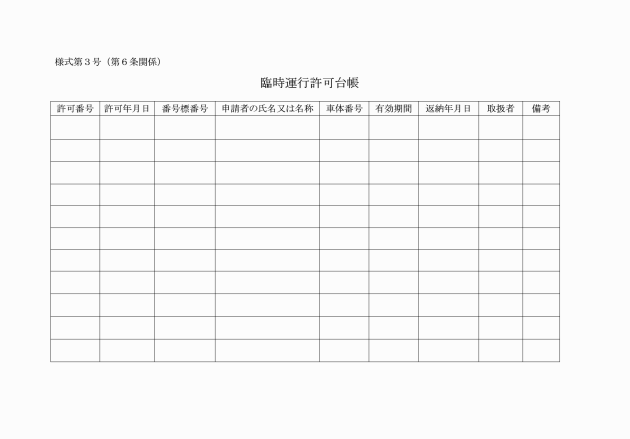 第6条 許可をしたときは、臨時運行許可台帳(様式第3号)に所要事項を記載し、常に状況を明らかにしておかなければならない。