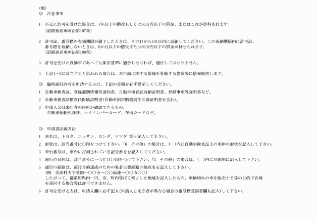 第3条 許可を受けようとする者(以下「申請者」という。)は、村長に対し、所定の事項を記載した自動車臨時運行許可申請書(様式第2号)を提出し、かつ、自動車損害賠償保障法(昭和30年法律第97号)第7条に定める自動車損害賠償責任保険証明書(自動車損害賠償責任共済証明書を含む。)を提示しなければならない。